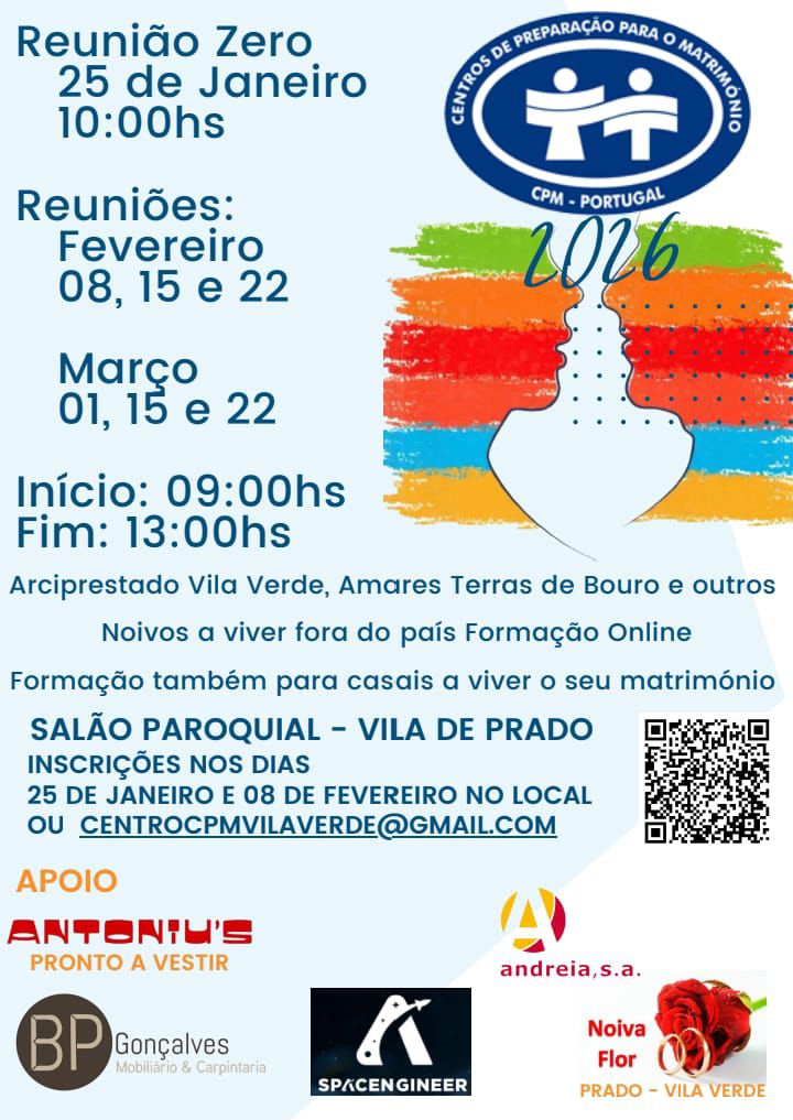 O Centro de Preparação para o Matrimónio (CPM) do Arciprestado de Vila Verde vai iniciar, no início de 2026, um novo ciclo de encontros destinados a noivos que se preparam para o sacramento do Matrimónio. A Reunião Zero está marcada para 25 de janeiro, às 10h, no salão paroquial de Vila de Prado.
